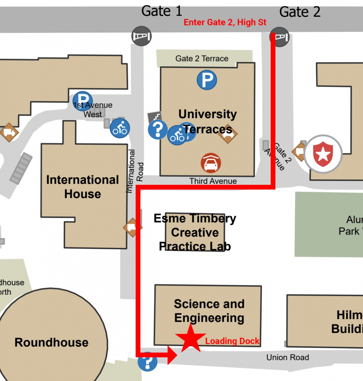 There is a loading dock for the transportation of larger items that cannot fit into our passenger lift. The loading dock is located in the Science & Engineering Building (SEB), map reference E8. The loading dock is on Union Road and is shared with other university facilities.