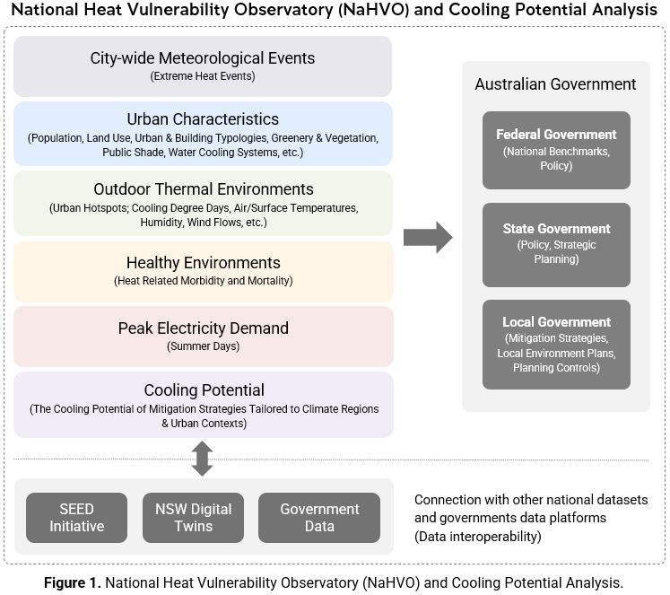 The National Heat Vulnerability Observatory (NaHVO) aims to develop rigorous national datasets and an innovative, robust and consistent methodology to report and measure the heat vulnerability issues and cooling potential of Australia’s cities. NaHVO will provide: