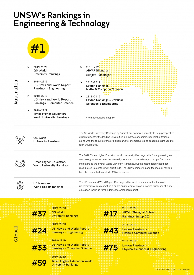 UNSW Engineering is the largest engineering faculty in Australia and offers the widest range of engineering degrees in the country. With eight schools and more than 70 years’ experience, our researchers are at the forefront of exciting technological developments, engaging in partnerships both here and overseas. Our consistently high global academic rankings across engineering disciplines reflects the depth and breadth of our teaching and research.