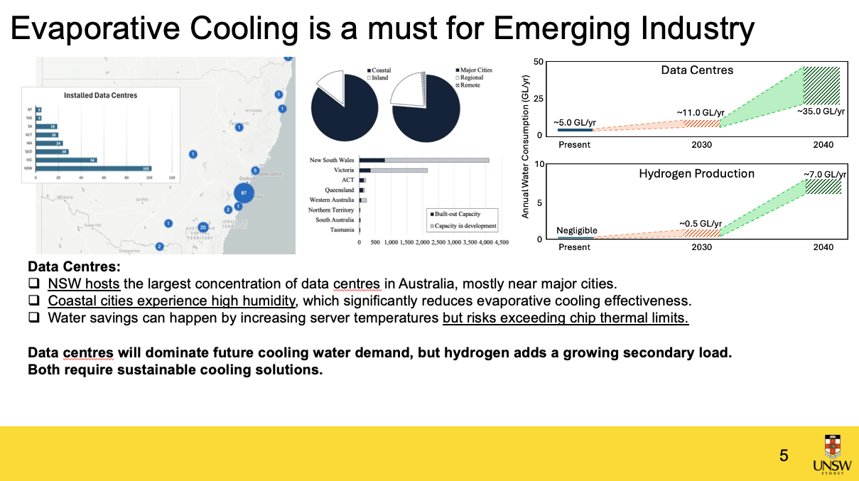 By projecting sector growth alongside evolving cooling technologies, the UNSW Engineering team is offering government and industry clear, data-driven pathways to reduce resource intensity. The work highlights both the risks of inaction (e.g., water demand potentially doubling by 2030 in NSW) and the long-term benefits of proactive, sustainable design in alignment with national net-zero and resilience goals.