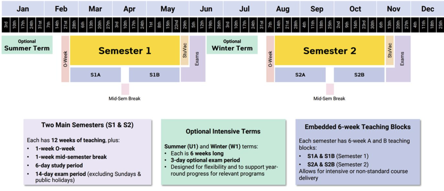 From 2028, the University will move to a flex-semester calendar, which means your program will be delivered across two core semesters instead of the current three-term structure. Faculties are carefully redesigning program and course structures to maintain a logical progression of learning and high academic quality.